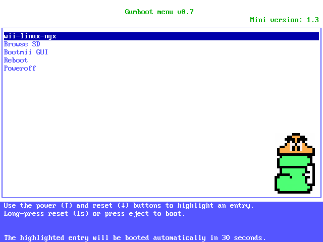 Gumboot is a MINI-based boot menu for the Wii, created by neagix, specifically for use on his wii-linux-ngx project. Techflash ended up making a fork of Gumboot to fix bugs and update it for the modern era. Gumboot is currently the main bootloader used by the Wii-Linux project.